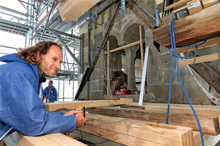 Das Zimmererteam der Firma Jako Baudenkmalpflege saniert Dach und Dachstuhl der Stadtkirche. Die Fachleute nehmen sich nach den Reinigungsarbeiten Schritt für Schritt der Schäden an den Balken an, erneuern verschiedene Abschnitte und decken das Dach.