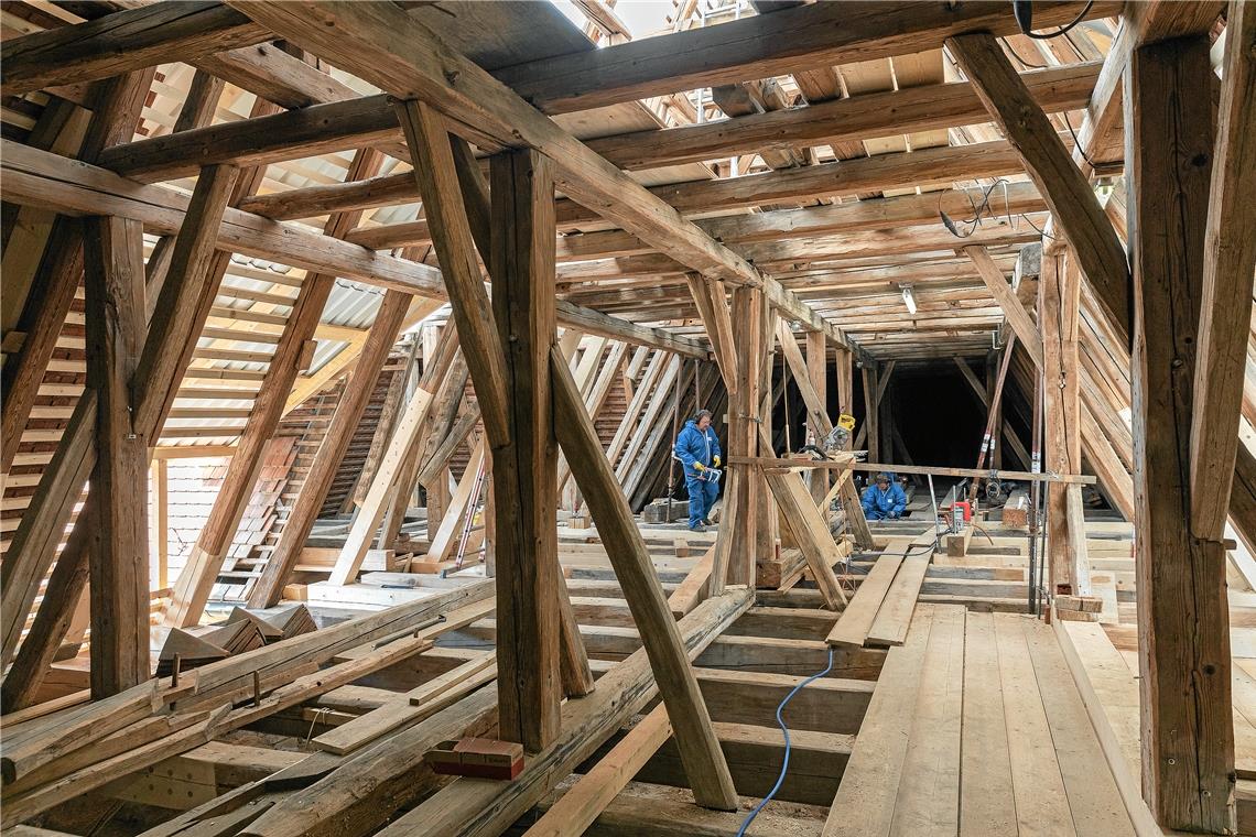 Das Zimmererteam der Firma Jako Baudenkmalpflege saniert Dach und Dachstuhl der Stadtkirche. Die Fachleute nehmen sich nach den Reinigungsarbeiten Schritt für Schritt der Schäden an den Balken an, erneuern verschiedene Abschnitte und decken das Dach.