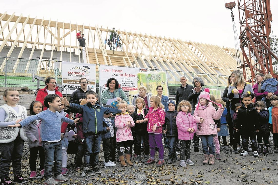 Nicht nur die Mächen und Jungen der evangelischen Kindergärten Klosterhof und Oetingerhaus werden sich freuen, wenn der Neubau für die künftige gemeinsame Einrichtung in einigen Wochen eröffnet werden kann (das Foto entstand beim Richtfest vor fast genau einem Jahr), sondern auch Eltern, die noch einen Betreuungsplatz brauchen. Das Oetingerhaus wird nach dem Umzug der Kinder von der Stadt übernommen, so können weitere Betreuungsmöglichkeiten zur Verfügung gestellt werden. Archivfoto: J. Fiedler