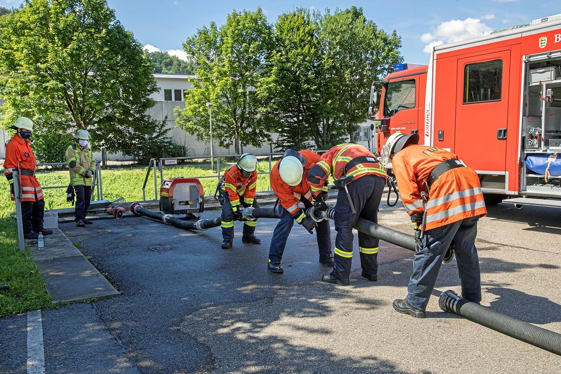 Schweres Geschäft: Dieses Quartett ist gerade dabei, eine Wasserversorgung aus der Murr aufzubauen, die am Murrhardter Feuerwehrhaus vorbeifließt. Fotos: J. Fiedler