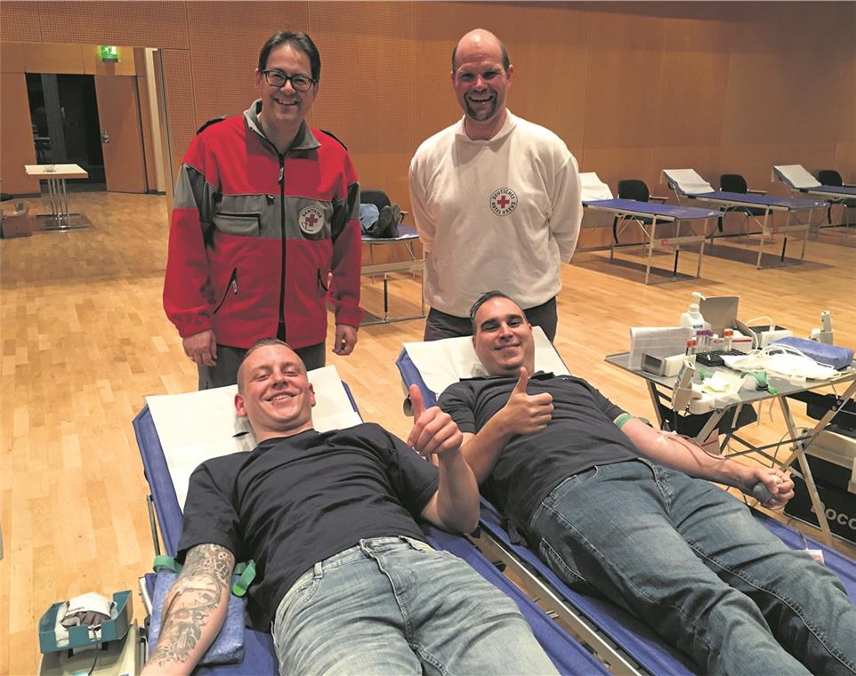 Thorsten Gabriel und Matthias Schlichenmaier von den Murreder Henderwäldlern (von links) sind gerade beim Spenden. Das freut auch Matthias Müller und Philipp Wolff (hinten von links). Foto: privat