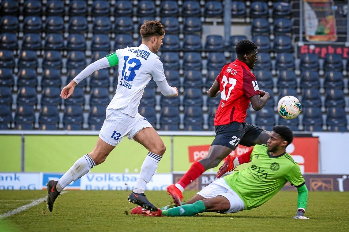 Eine Szene, die das Spiel entscheiden hätte können: Andrew Owusu ist unterwegs zum 2:0 und wird von Torwart Leonnel Mballa Mvogo zu Fall gebracht. Den Elfmeter gab es trotzdem nicht und am Ende musste sich die SG gegen den Vorletzten Alzenau mit einem kümmerlichen Punkt begnügen. Foto: A. Becher
