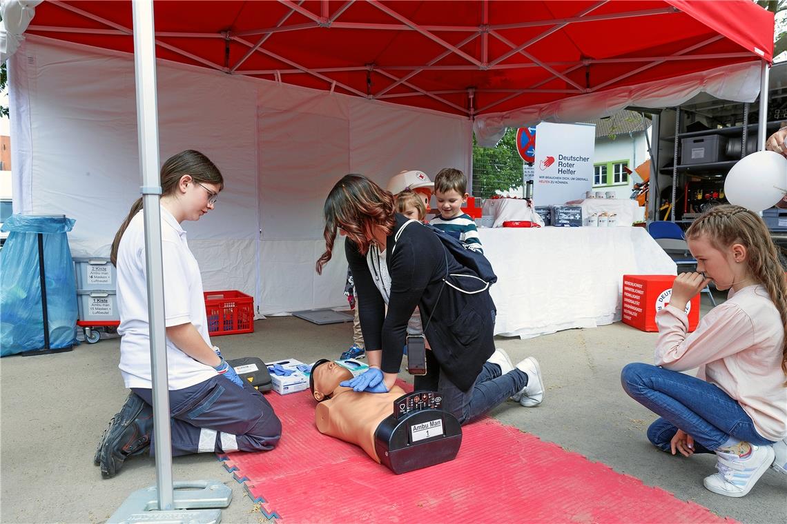 Das Freigelände ist ideal für das Deutsche Rote Kreuz (DRK) und die Feuerwehr Murrhardt, um sich zu präsentieren. Die DRK-Rettungshundestaffel beeindruckt mit Vorführungen ihrer Suchteams an Geräten wie Wippe, Tunnel oder Sprossenweg und durch das Aufeinander-eingespielt-Sein von Mensch und Tier. Beim DRK-Ortsverein lässt sich Reanimation inklusive des Umgangs mit einem Defibrillator üben, und die Feuerwehr informiert über das richtige Verhalten bei einem Brand, zu ihrer Arbeit und was Voraussetzungen für ein Engagement bei der Truppe sind. Später tourt außerdem Grisu als gar nicht so kleiner Drache und Feuerwehrmaskottchen nicht nur zur Freude der Kinder durch die Hallen. Apropos Kinder – für die halten Manfred Krautter und Walter Hieber in einem Miniwaldareal Angebote wie Holzfiguren bemalen oder ein kniffliges Baumpuzzle bereit.