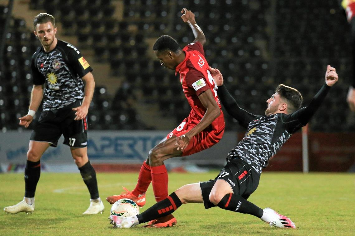 Großaspachs Mohamed Diakite (rotes Trikot) wird nicht nur einmal vom Koblenzer Behadil Sabani hart attackiert. Foto: A. Becher