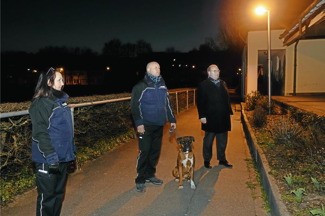 Martina Wasiliew und Oliver Volkmer inklusive Boxer Bert drehen mit Bürgermeister Armin Mößner (von links) eine abendliche Runde durch die Innenstadt. Selbst an der Stadthallenterrasse sind keine Jugendlichen auszumachen. Normalerweise ein typischer Treffpunkt für Gruppen.